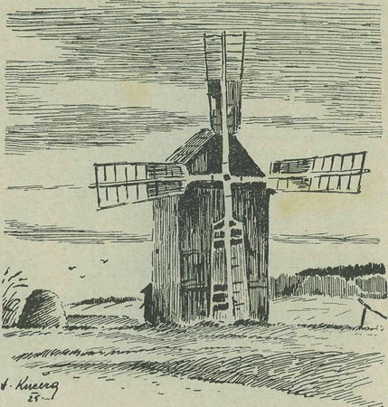 větráků. Všude tam jsou na kopcích i na rovině směrem ke* Kroměříži, Přerovu, Dřevohosticům i Bystřici a Frýštáku, všechny stejně zajímavé a romanticky vábné. Chodíval jsem tehdy od jednoho k druhému a nemohl jsem se nakochati překrásnou vyhlídkou na širý kraj podhostýnský, když smrákal se k večera modravě zapředený v nekonečnou tkáň kouře z bramborových ohnišť a když obrovská křídla takového mlýna černě, pohádkově strměla do žhoucího kotouče krvavě zapadajícího slunce. Když jsem pak jezdil z Olomouce do Velkého Meziříčí, vídal jsem z vlaku větráky u Bedihoště a na Vyškovsku, ale ovšem nikdy jsem se k nim nepřiblížil. A podobně jsou jistě ještě mnohé rozptýleny po našich krajích, čekajíce na vlastivědného pracov-