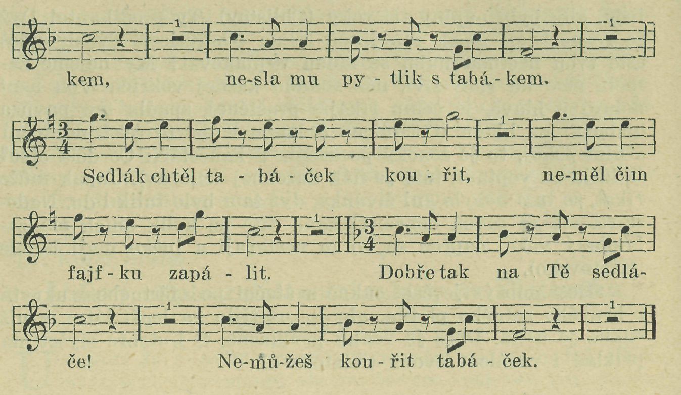 Číslo 1. (Výmluva) zpívala Klestilová, svobodná dcera kovářova ze Střelic. Č. 2. (Daleko provdaná) maminka pana nad-učitele (z Měníka). Č. 3. (Přání) nádenice Zefka Škopová z Hradečné u Litovle. Č, 4. (Útěcha, z Vránové Lhoty) matka p. nad-uěitele. Č. 5. (Syneěek) jakási stařenka osmdesátiletá ve Svá-