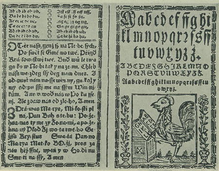 Po druhé straně tohoto dřevorytu jest dvoudílný obrázek: známá první pomůcka školní, kohoutek, jak s proutkem učí abecedě a modlitbě Páně. Viz zmenšený obrázek 10.