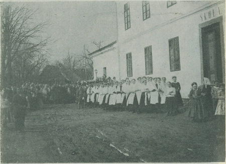 Děvčaia o pohřbu v bílých plachtách v Zubří u Rožnova. (Fotografii zapůjčil pro Český Lid P. Alois Pozbyl.)
