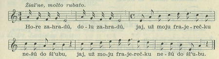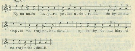 3. Hodz by udereli zlatého holuba, každý idze lem tam, dze mu dzevka ľúba, ej, každý idze lem tam, dze mu dzevka ľúba.