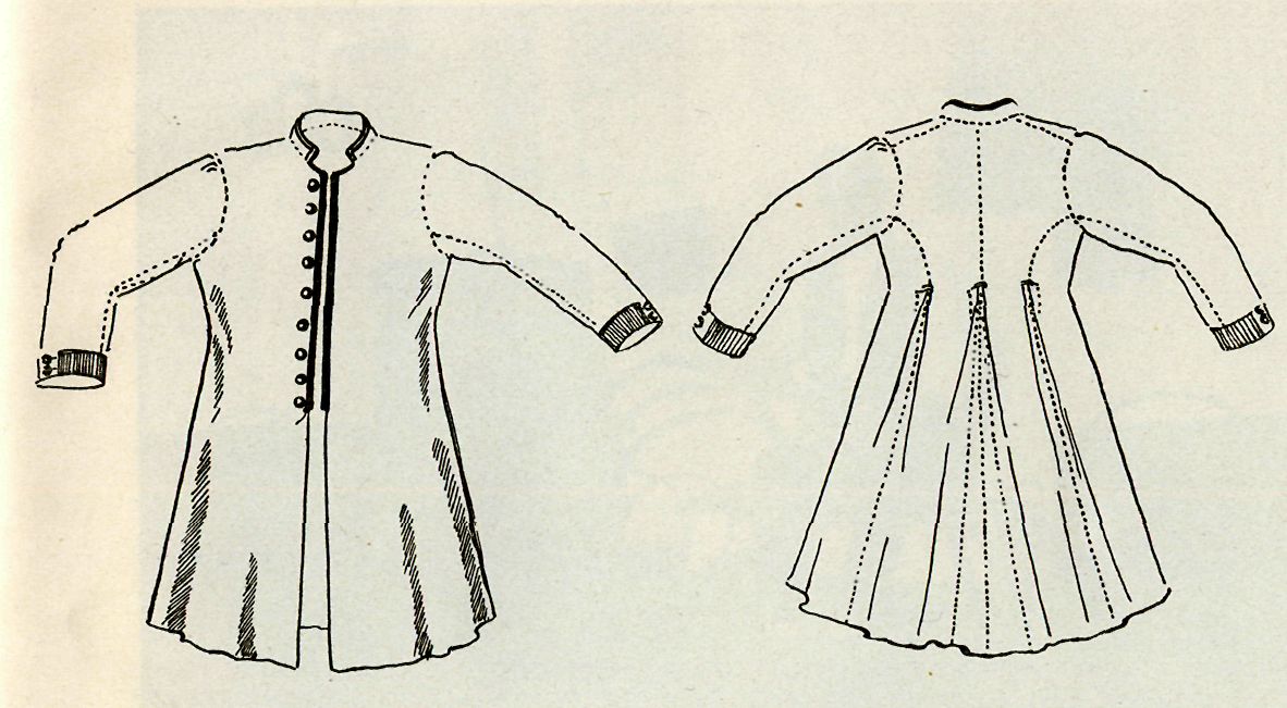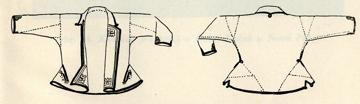 Obr. 13. Součásti krojů s vyznačením střihu. Kabáty: 3. a), b) mužský „kabát“ z Velké u Strážnice.