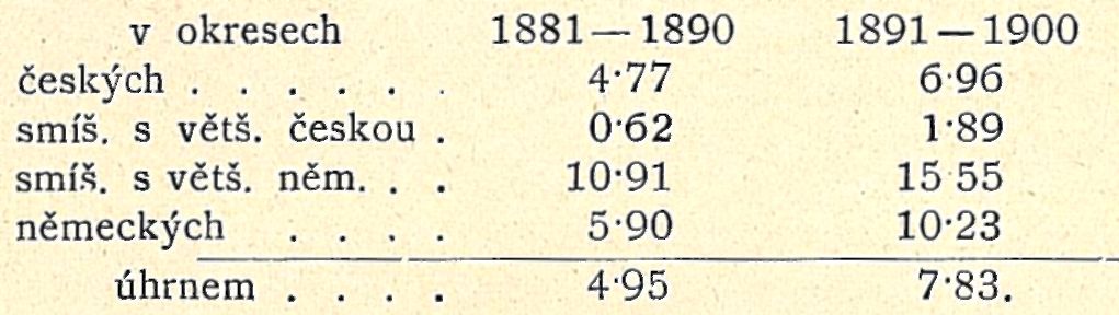Nepříznivé poměry předminulého desítiletí co • do všeobecného vývoje obyvatelstva byly tedy v posledním desítiletí v neprospěch český ještě více stupňovány. Tak přibývalo v desítiletí 1881—1890 v ryze německých okresech o 1,13% rychleji než v okresech ryze českých, v posledním období však již o 3,27% rychleji než v oblasti ryze české.