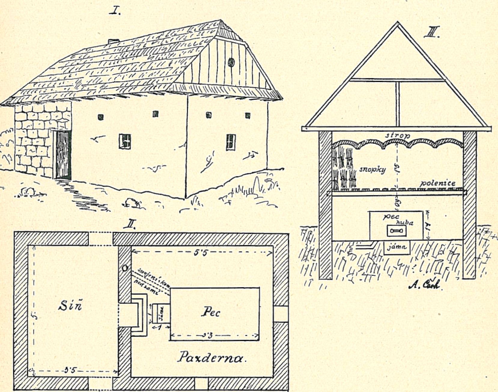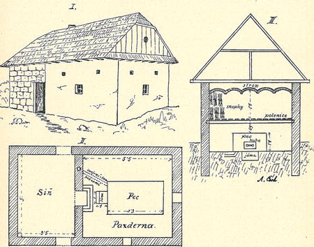 I. Pohled. — II. Půdorys. — III. Řez příčný.