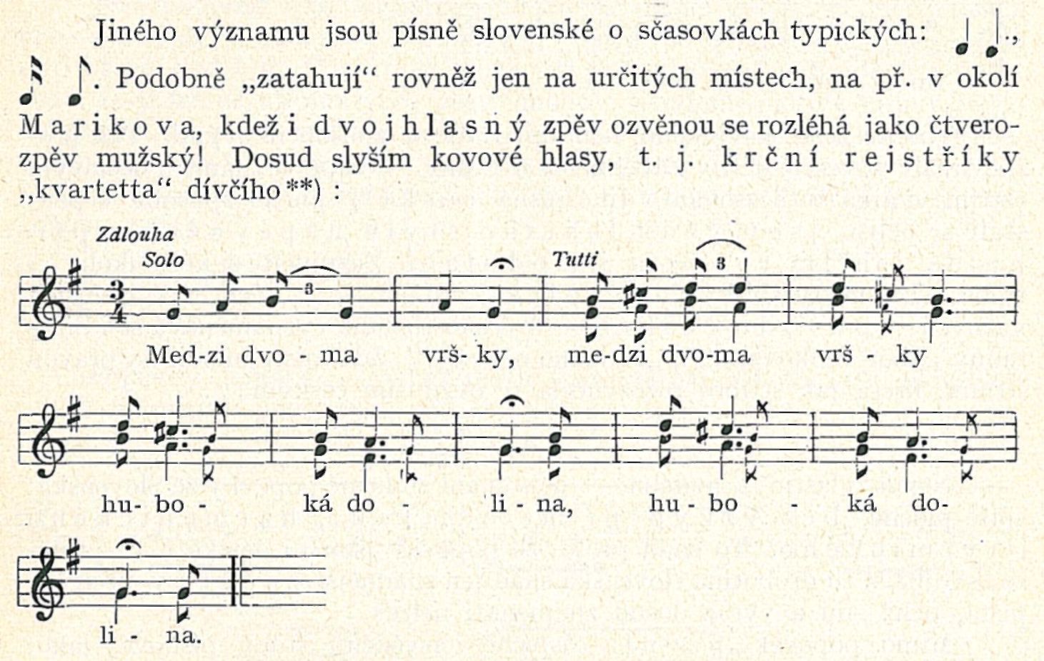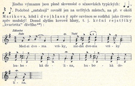 Slovenské písně podobné nejvíce blíží se písním českým; jsou nápěvně skoro všední, bez charakteristiky v pravdě hudební. Takové jsou mnohé ze „Slovenských spevů" *) Kadavého, Ruppeldta aj:, tak zpívá lid slovenský — ovšem jen na místech určitých.