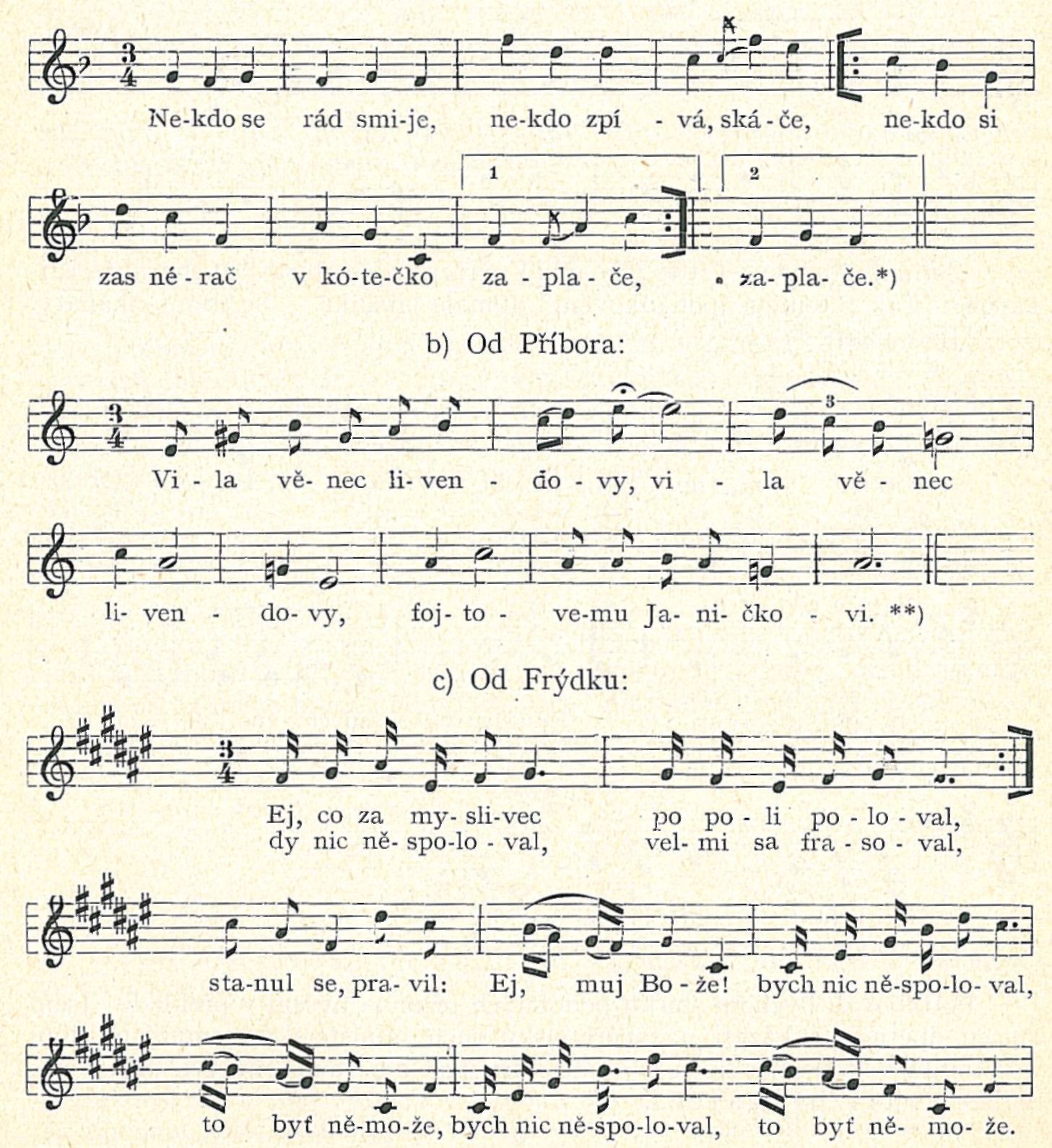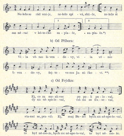 V příčině nápadné ethnografické barvy nápěvů t. zv. k m e n n ý c h buďtež z ostatních našich písní k disposici ještě tyto: