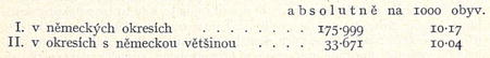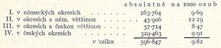 Z toho jest patrno, že i v desítiletí 1891—1900 byl zjištěn větší přirozený přírůstek v okresích českých než německých. Toho se zželelo Rauch-bergovi a proto na str. 221 a 222, kde o věci ještě jednou mluví, opravuje uvedený výpočet proto, že prý jest třeba učiniti malé přesunutí v hranici mezi čistě německými okresy a okresy s německou většinou. Přesunutí ono pak vysvětluje v poznámce drobným tiskem opět jinde a sice na str. 180. A jak klassicky! Čekal by každý, že hoření rozdělení okresů obsahovalo chybu, a že novým rozdělením chce se Rauchberg přiblížiti skutečnému stavu. Avšak naopak! V hořením rozdělení jest Duchcov správně zařáděn mezi okresy smíšené, v rozdělení opraveném však společně s Teplicemi mezi okresy čistě německé a výsledek se jeví tento: