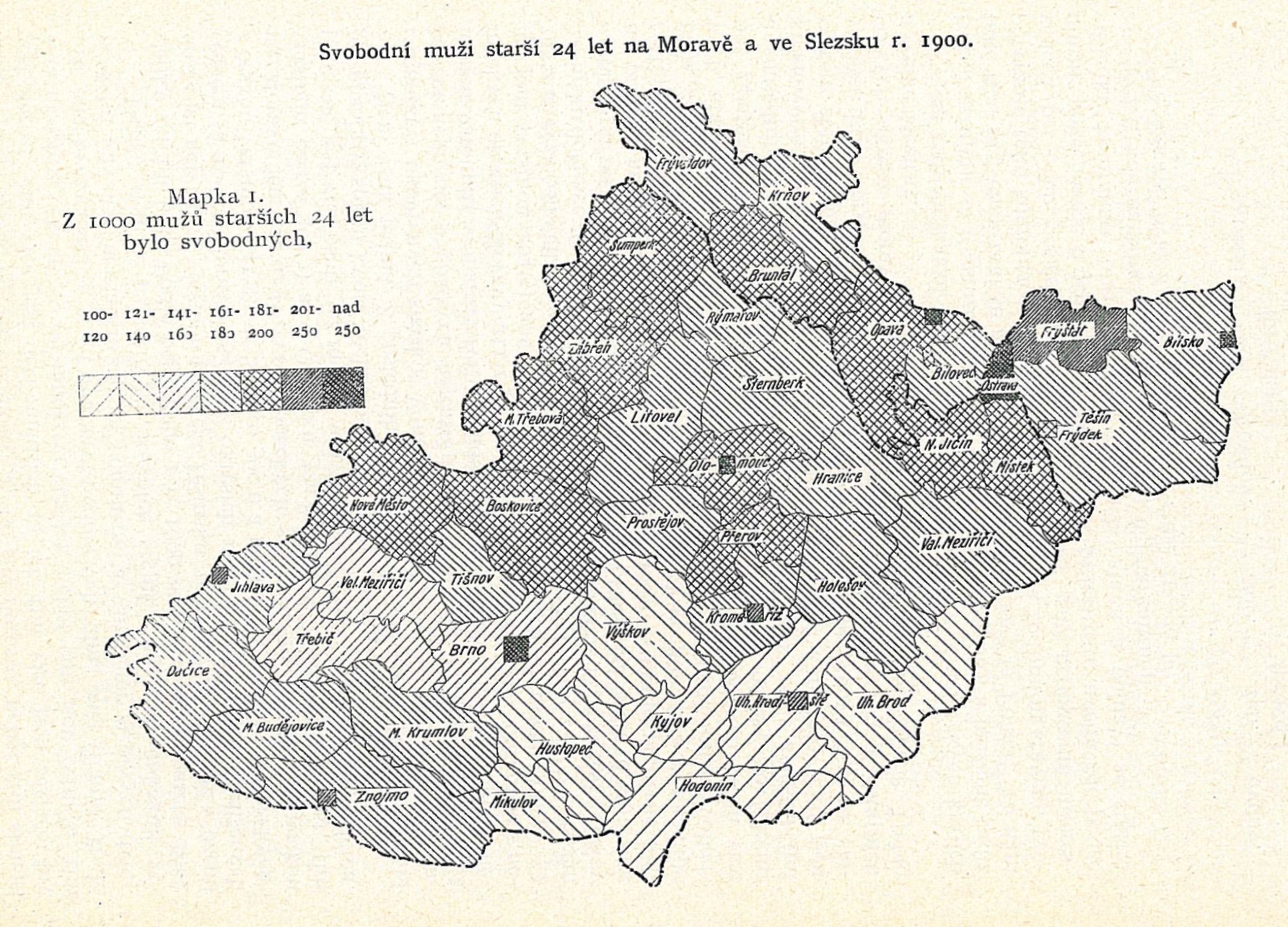 Svobodní muži starší 24 let na Moravě a ve Slezsku v r. 1900