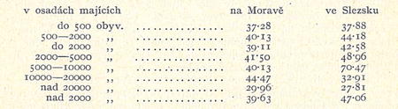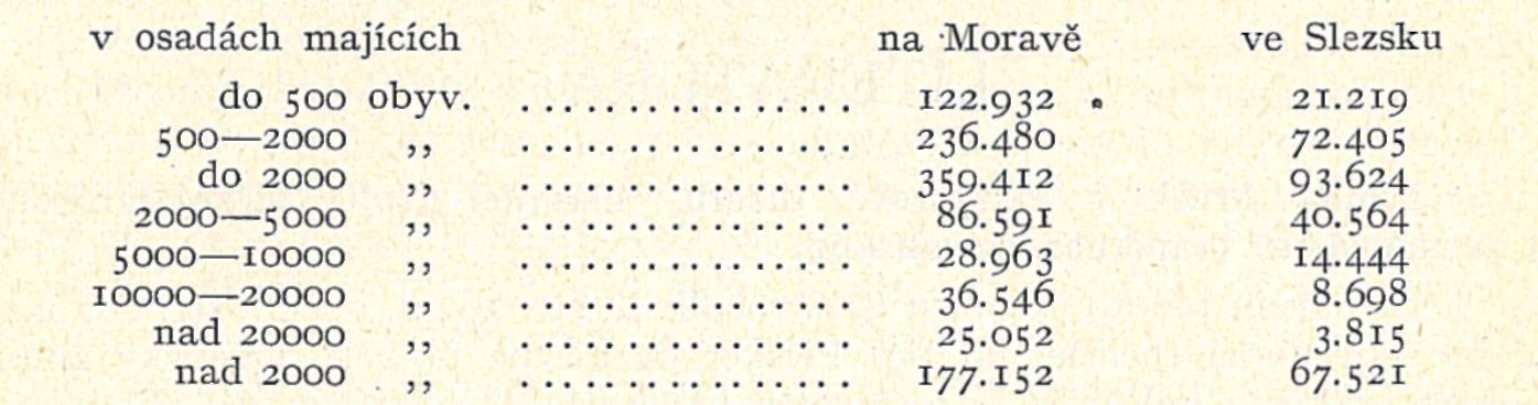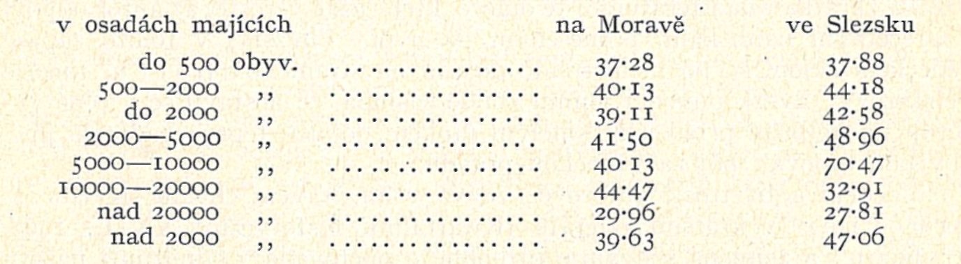 Celkem tedy i na Moravě, zvláště však ve Slezsku rodí se poměrně ve městech více dětí než na venkově. To ovšem neznamená, že také na venkově jest menši plodnost; zajisté že jest tomu právě naopak. Venkovské obyvatelstvo jest však z největší části zemědělské, kdežto ve městech zastoupen jest více průmysl, který připoutává к sobě zvláště mladší vrstvy obyvatelstva, odtud poměrně četnější porody v městech. Potvrzuje to zvláště nadnormální množství narozených dětí v osadách od 5000 do 10000 obyv. ve Slezsku, к nimž patří hlavně rozsáhlé osady uhelného revíru v okrese fry-štátském. Za to moravská města s více než 20000 obyv. a slezská s více než 10000 obyv. vykazují silně podnormální počet narozených, poněvadž, jak ze zkušenosti víme, obyvatelstvo jejich náleží hlavně třetí a čtvrté skupině zaměstnání, jejichž dorost jest velice slabý.
