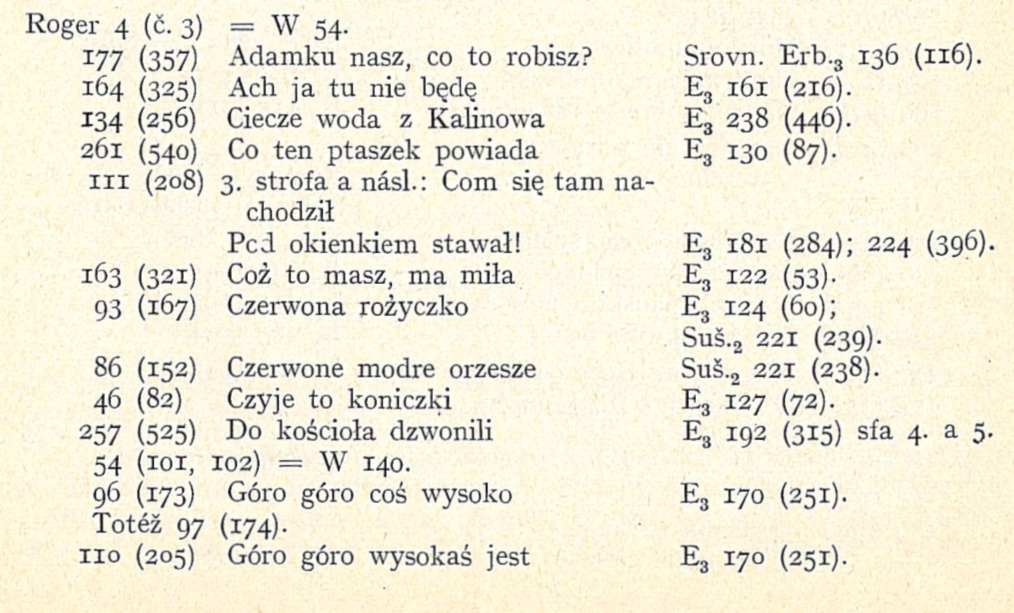 Již Zíbrt poznamenal ve svém Bibl. přehledu str. 89, že „písně mnohé v této sbírce ,lidu polského' ve Slezsku jsou totožné s písněmi českými" a uvedl 3 příklady. Sestavil jsem všechny písně shodné s našimi a srovnal se sbírkou Erbenovou a tu a tam Sušilovou. Připojuji tento seznam zde; může býti jakýmsi doplňkem. Nemohu ovšem uváděli obšírně ostatních variantů československých a polských, ježto i tak již referát příliš vzrostl. U písní, jež jsou obsaženy v „Katalogu", odkazuji na řadové číslo jeho. (Katalog označuji pism. W.)