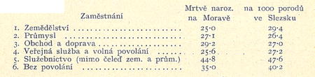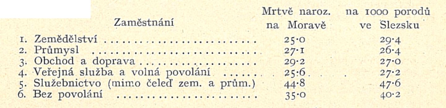 Na zemědělské obyvatelstvo připadá na Moravě méně, ve Slezsku však více mrtvě narozených, než na průmyslové, v Čechách pak rozdíl jest minimální. Vysoké číslo u 5. a 6. skupiny povolání vysvětlí se tím, že většina porodů na ně připadajících je nemanželská.