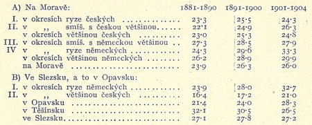 Vůbec pak bylo by třeba dalších podrobnějších studií, aby se mohlo bezpečně říci, od čeho závisí množství mrtvých porodů. Zde můžeme jen konstatovati, že jest jich méně u Čechů než u Němců, méně u katolíků a židů než u protestantů, a dále že jich méně připadá na porody manželské než nemanželské.