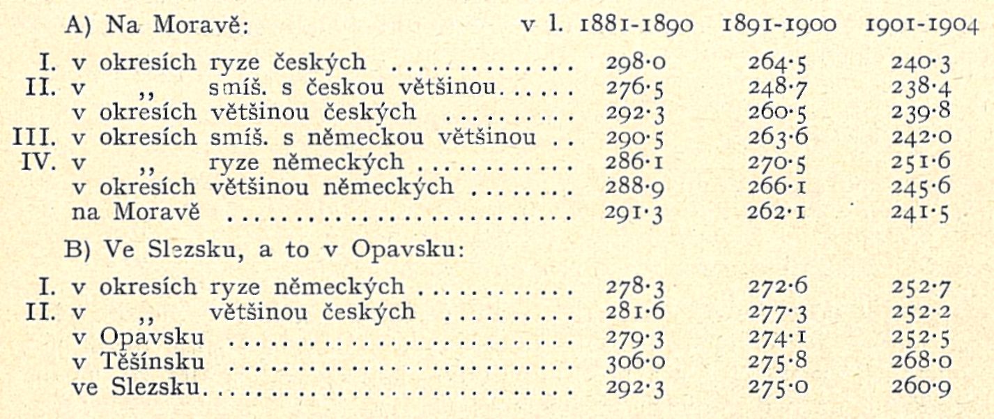 Nej důležitější úkaz, který z těchto číslic můžeme vyčisti, jest ten, že úmrtnosti na Moravě i ve Slezsku od r. 1880 zrovna tak jako v Čechách značně ubývá; zmenšení její jest zároveň důkazem zlepšení sociálního a zdravotního stavu obyvatelstva. Úmrtí ubylo poměrně ve všech národnostních oblastech, většinou i absolutně. Na Moravě jest pro nás velice slibné, že na klesání úmrtnosti jest účastno mnohem větší měrou území české než německé; zlepšení u tohoto obnáší v 1. 1891—1900 proti desítiletí předcházejícímu 22-8, u onoho зг8 na 1000 obyvatelů. Tím se stalo, že v posledním desítiletí 19. století zemřelo již poměrně méně lidí v okresích většinou českých než v okresích většinou německých, ačkoli ještě v období předešlém bylo tomu obráceně. V poslední době pak se rozdíl mezi oběma oblastmi v český prospěch ještě více zvětšil. Ve Slezsku bylo na klesání úmrtnosti účastno hlavně Těšínsko, tak že se v desítiletí 1891—1000 vyrovnalo téměř úplně Opavsku, v němž se poměry zlepšily jen nepatrně; v prvních letech 20. století Opavsko však opět značně předstihlo Těšínsko.