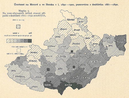 Úmrtnost na Moravě a ve Slezsku v 1. 1891—1900, pozorována s desítiletím 1881—1890.
