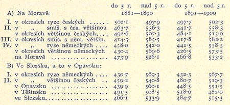 Poměr zemřelých dítek v nejútlejším věku к ostatním úmrtím není všude stejný a řídí se hlavně silou dorostu; kde se rodí více dětí, tam jest také silněji zastoupena dětská úmrtnost (v Těšínsku a v okresích ryze českých na Moravě). Stanovení úmrtnosti dospělých a dětí starších 5 let v jednotlivých národnostních oblastech není, bohužel, možno, poněvadž není zjištěno, jak je v obyvatelstvu podle okresů tento věk zastoupen.