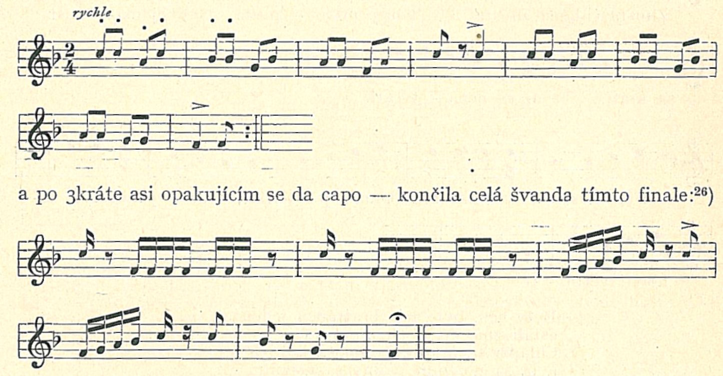 Obdarován v každém domě jiným způsobem (slaniny napíchly se vždy na rožeň), vytáhl průvod za stálého vyskakování, výskání a louskání • kra-jovicemi27) na náves. Večer bývává obyčejně „musika".