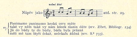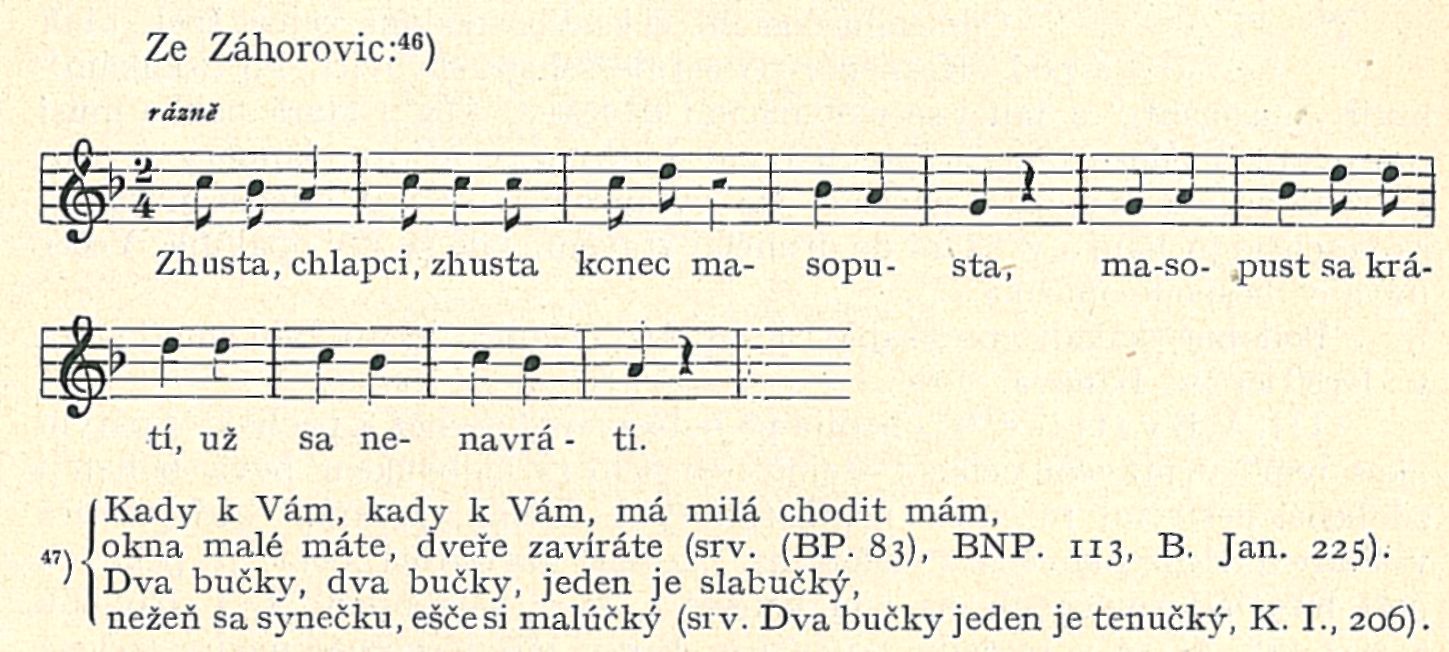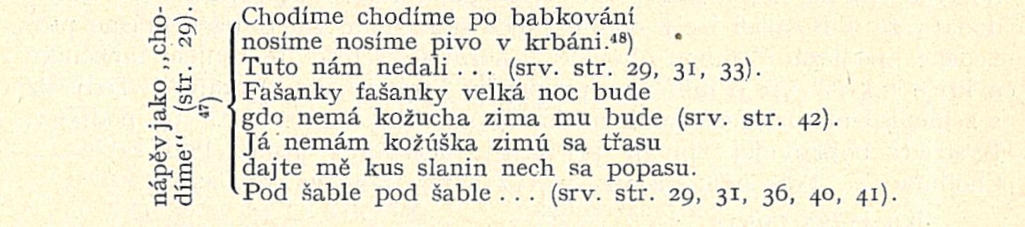 46) Zpíval J. S., chovanec Zem. střed, hospodářské školy v Přerově. 47) Vždy celá řada písniček v jedné melodii. 48) Krbaň, starý hrnec. Bart. Dial. Slov. 162.