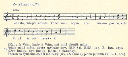 masopust dům od domu s muzikou (obyčejně s harmonikou nebo houslemi, někdy i s basou а р.). Nad sebou mívají stárka, který chodívá po předu a nosí s nimi „právo" (obyčejně opentlenou vysoustruhovanou ruku), za nimi hoch přepravený za žida s košem v ruce a měchem na zádech. Cestou před domem zpívají: