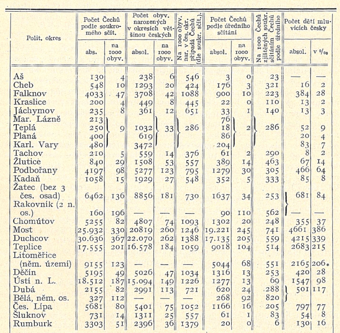 býti. Nepřímo na sílu menšin můžeme souditi z počtu oněch obyvatelů, jichž rodiště nachází se v okresích většinou českých; ovšem za základ se tato čísla také vzíti nemohou, poněvadž zajisté také z českých okresů přistěhovalo se na německé území něco Němců a naopak také v okresích německých se narodilo mnoho Čechů, hlavně kde české menšiny jsou usazeny již od delší doby. Posléze o síle českého živlu na území německém poučuje nás nepřímo množství dětí škol obecných a měšťanských umějících česky, ačkoli ani tu, zdá se mi, školní úřady velikou svědomitostí při zjišťování znalosti řeči u žactva nevynikají. Spojíme-li všecky tyto prvky dohromady, budeme moci utvořiti si správný úsudek o síle českých menšin a hlavně soukromé sčítání teprve oněmi ostatními momenty dojde náležitého osvětlení.