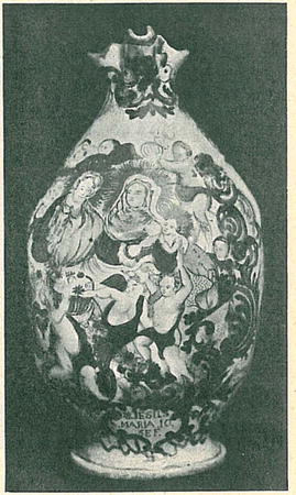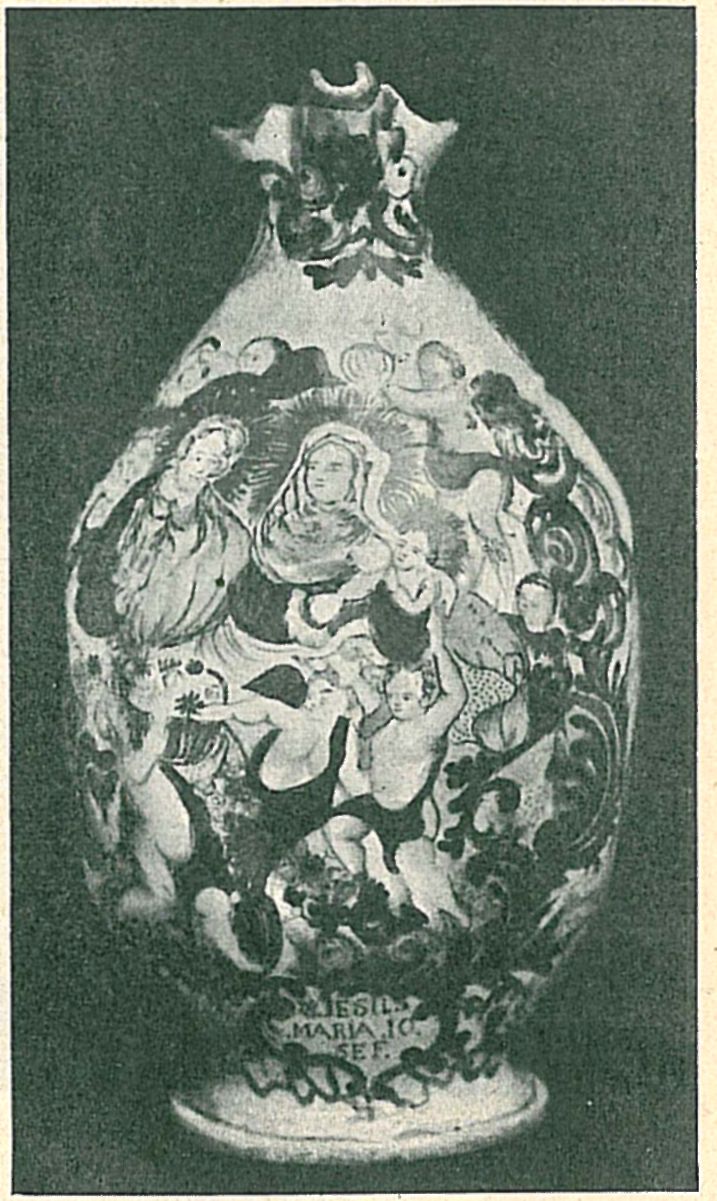 Na čepáku jest provedena krásná figurální malba v provedení a barvách velice příbuzná malbám, jaké vídáme na italských majolikách. Josef a Maria s Ježíškem obklopeni jsou obláčky, z nichž vystupují bud hlavy nebo celá nahá tílka andílků. Práci tu přičítám Františkovi Bartoškovi z těchto dů- ' vodů: Nalezla se v Ježkovicích, vesničce nedaleko Vyškova, jako džbán cechu soustružnického, tedy na té straně, kde měli nejblíže džbánkáře vyškovské. František Bartošek (též Bartošík) jest poprvé dosvědčen ve Vyškově 23. dubna r. 1771, kdy se ženil, ale již v zápisu svatebním jest označen jako „figulus et civis", t. j. mistr. Ženil-li se ve Vyškově,, jistě byl již dříve a to aspoň rok ve Vyškově. Chtěl-li se někdo stati mistrem, musil se napřed za-