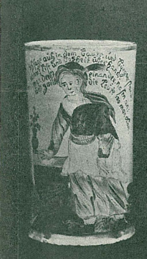 c) Pestrobarevný džbán z г.. 1787. Z barev vyniká nejvíce purpurověčervená. (Z mé sbírky.)