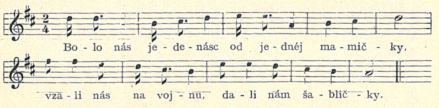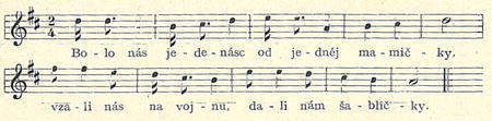 Kdysi za blankytného, letního odpoledne, když slunečko za hory už se sklánělo, potkal jsem mladou kopaničárku. Ne na Zítkové, na jiné kopanici — na Vápenicích. Chtěl jsem po ní písničku. Zdráhala se z počátku, líčka jí zahořela, ne a ne zazpívat. V tom však už kombinovala v duchu — pozoroval jsem to — dala si říci, vzpomínala. Najednou však podrážděně vyhrkne ze sebe: „Tož jakú?" Nejakú, jak je třebas tato — a zazpíval jsem jí píseň: