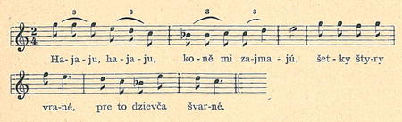 — nebo jsou písně ty téhož charakteru, jako ostatní kopaničárské, j e ž vůbec postrádají onoho svérázného rytmu slováckého, jakož zvláště příbuzný jsou písním různých sčasovek „podružných", na př.: