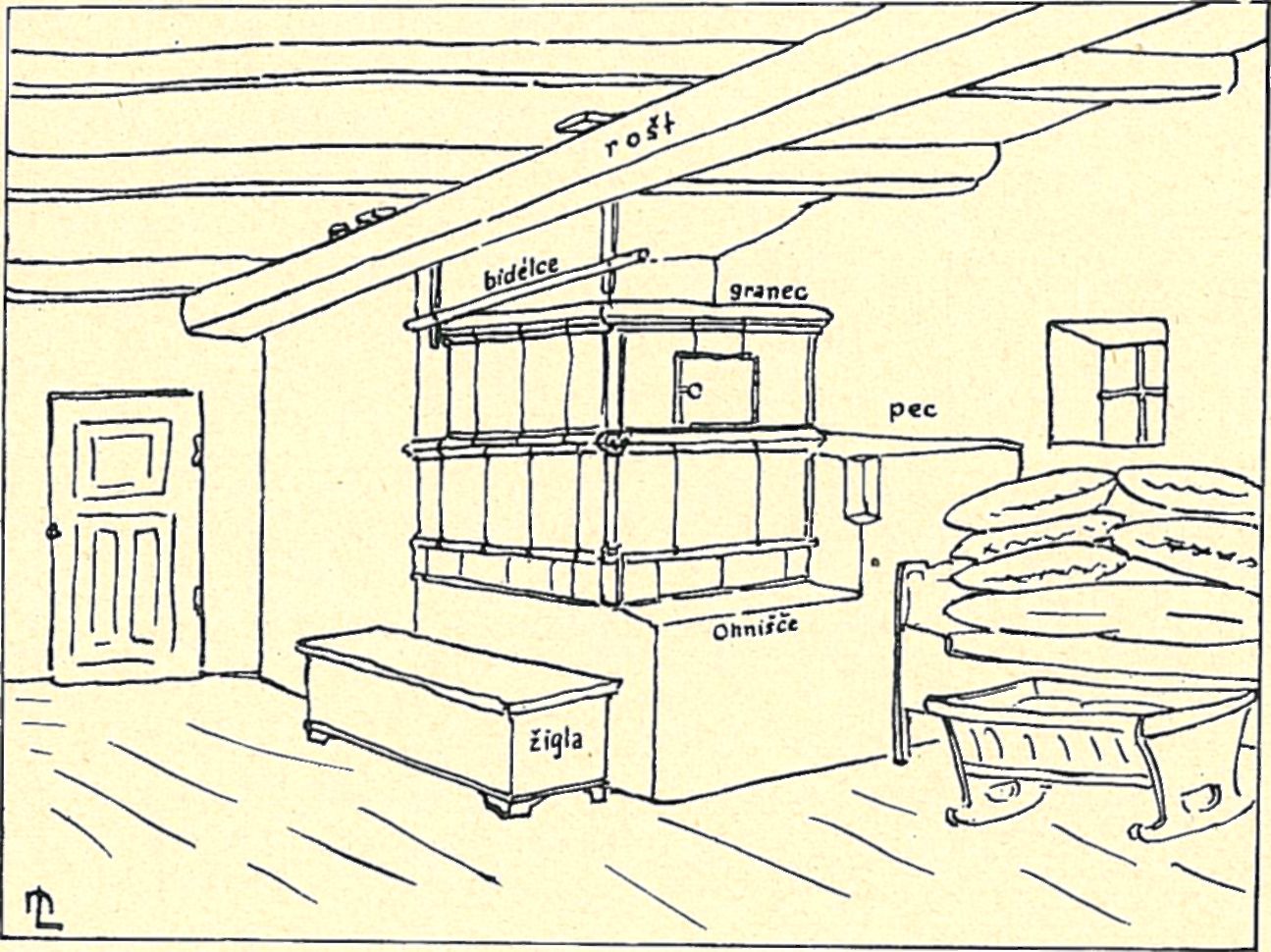 vající římsa kamen sluje g r a n e с. V kamnech býval zadělán medený nebo železný hrnec na zahřívání vody a vaření šišek (knedlíků), zv. kamnové c; nyní ve svrchní řadě kachlů bývá trúba. Kolem kamen a peci jsou dřevěné lavice (lávky, la vy). Nad kamny, připevněné na roště, visí b i d é 1 c e, na nichž se v zimě suší prádlo, šatstvo, kožuchy a haleny. V protějším koutě jizby, okrášleném hojnými obrazy, stojí stůl s lávkami; v druhém koutě u zdi je postel (p o h r á d-k a, lůžko), na níž spává hospodář s hospodyní a vedle níž je kolébka; dále při stěně bývá ještě dlouhá truhlice ž i g 1 a zvaná (tak na