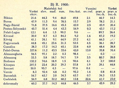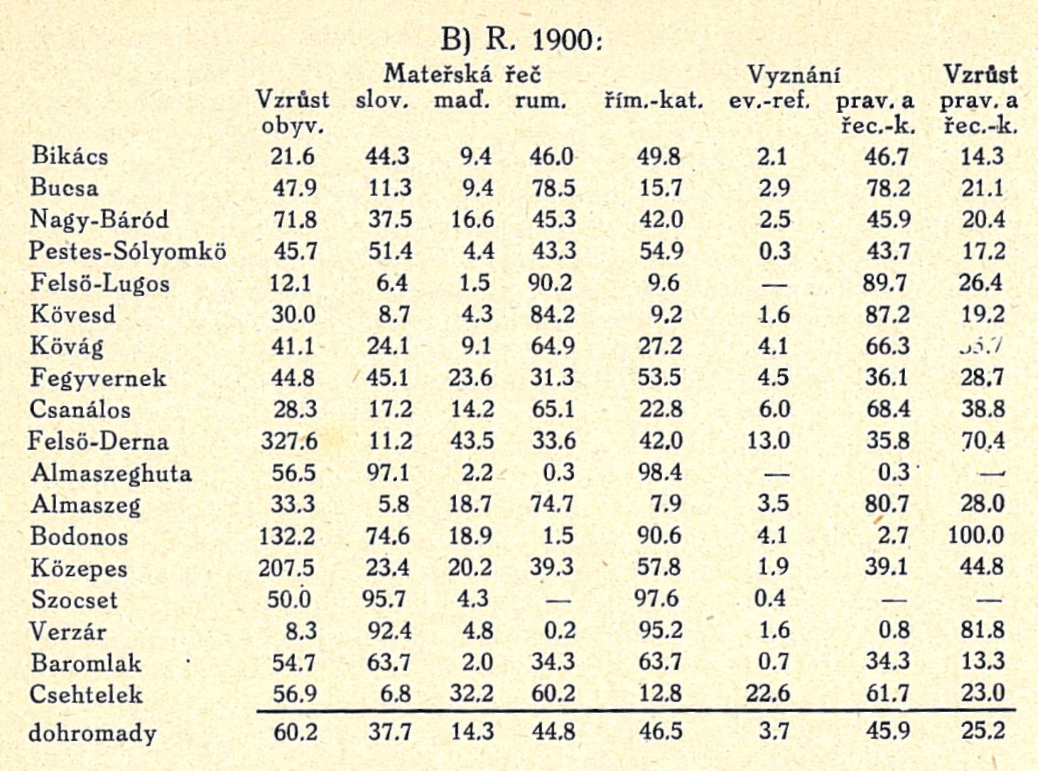 Celkem v těchto 18 osadách přibylo pravoslavných a řeckých katolíků jenom 25.2%, kdežto jejich obyvatelstvo vzrostlo o 60.2%. Poměrné zastoupení Slováků vyšinulo se za 20 let z 30% na 37.7%, Maďarů z 9.1% na 14,3%, naproti tomu procento Rumunů ustoupilo z 57,5% na 44.8%. V těchto končinách, jež jsme tu podrobněji pro-brali, pravoslavný živel rumunský před kulturně vyšším a vyspělejším slovenským a maďarským ustupuje, ve vzájemné soutěži neobstojí, a jsem přesvědčen, že když probereme všecky smíšené kraje, že sice najdeme výjimky, ale přece jenom v celku bude potvrzena these, již jsem shora pronesl, že méně vyspělí národové pravoslavní ustupují