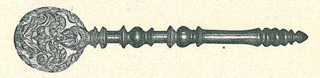 U nás v některých obcích měli „právo" v podobě ruky, jež svírala v pěsti jakousi zbraň, snad dýku, buď z mosazi nebo železa a připevněna byla na krátkou tyč asi 30 cm dlouhou (obr. 3, předvádějící právo, jež pochází z Čech).