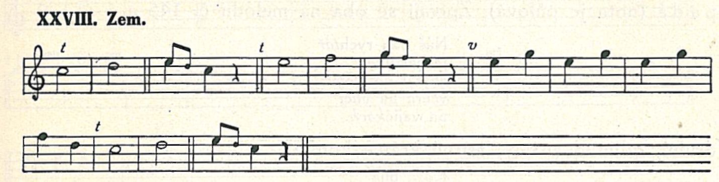 Druhý tanec z C. L. — nazveme jej b) —"liší se pouze vložkou, jež jest čtyřtaktová a trojdobá, ale rytmu furiantského (tančí se tedy ob-kročákem). Melodicky je podobna vložce „Měkoty" (viz př. XV.). Také Hol. V. 145 a (směsek) má čtyřtaktovou vložku trojdobou, ale nikoli furiantského rytmu, nýbrž sousedskou. Konečně patří sem tanec Chr. 505, který je sice bez textu, ale má název „višně", z hlavního textu odvozený; dle něho zvolil jsem název tohoto typu. Melodicky se v typech poněkud různí od předešlých; vložka je však příbuzná vložce Hol. V. 145 a, jsouc též čtyřtaktová sousedská (dvoutaktový motivek se opakuje). Rytmická schémata lze si snadno připojiti.