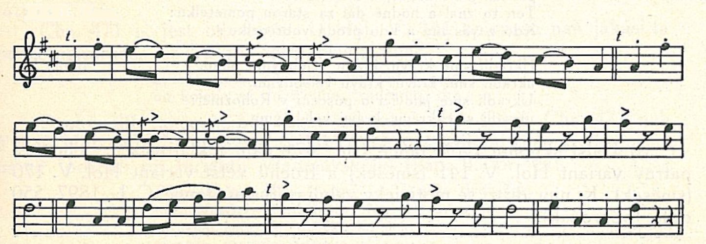 Jen typy a jsou pro „krávu" příznačné; typy b jsou od nich odlišné a blíží se melodicky motivu druhé části mé „špacírky" (viz př. A v кар. II.). Zápis je rytmicky správný, jen v notách polovičního trvání než my jej napíšeme: