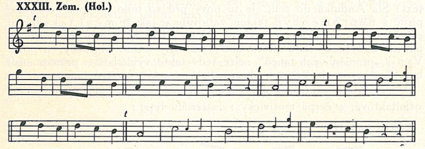Motivy a a b jsou zcela různé. První je pohyblivého charakteru a blíží se tím motivu „krávy", zvláště variantu Hoř. 16, který také sestupuje od oktávy, což je pro tento náš motiv význačné. Druhý proti tomu pohybuje se vzestupně v notách dlouhých, dvojdobé takty zcela vyplňujících, nebo jen v sudých taktech zdvojených, a blíží se tím spíše motivu „vejr vejr" (má však kroky terciové a je harmonicky jinak založen). Oba motivky vyskytují se v celé řadě směsků a třeba tedy dáti každému z nich jméno. Vybral jsem je z případných textů ve směscích — tance s těmito motivy jsou většinou instrumentální — a nazývám motiv a: „Rosa padla" a motiv b: „karafiát".