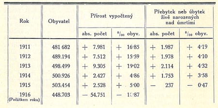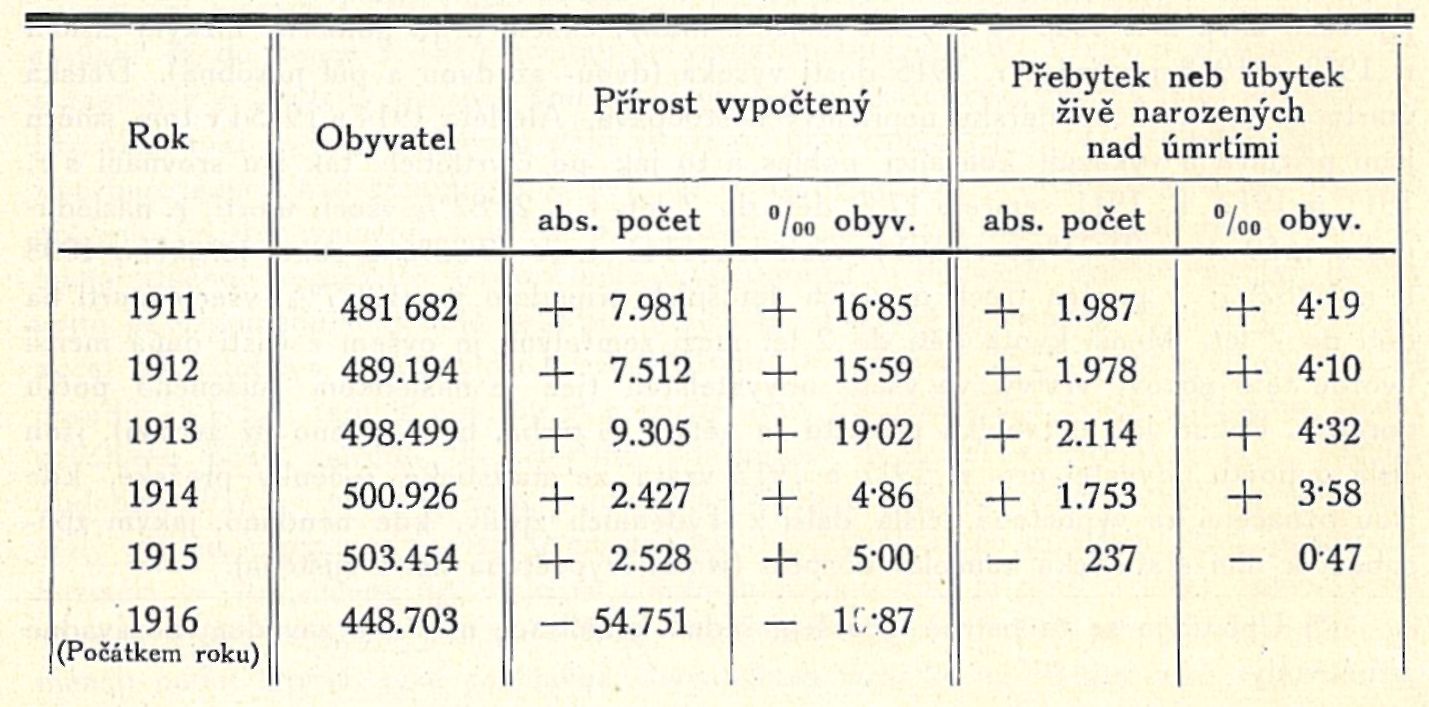 Tab. III. Přírost obyvatelstva v Praze a v hlavních předměstích v pětiletí 1911—1915.