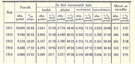 Tab. I. Porody v Praze a v jejích hlavních předměstích v pětiletí 1911—1915.