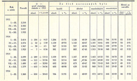 Tab. IV. Porody v Praze a v hlavních předměstích v pětiletí 1911—1915, pozorované v obdobích čtvrtletních.