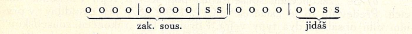 c) Zvláštní skupinu tvoří dva tance, Chr. 467 dole („hulán") a C L. 1899, 432 upr. („směsek"), melodicky malé varianty, v prvním dílu vůbec shodné. Tento první díl má typ „zakončení sousedskou" a obsahuje po osmi taktech dvojdobých (směsek z C. L. třeba opraviti dle pravidla I, tanec „hulán" je veskrze v osminách) dva takty třídobé. V druhém dílu vyhlíží tanec z Chrudimská též tak, jakoby končil sousedskou. Ale z důvodů architektonických nutno přičleniti z jeho šesti dvojdobých taktů dva poslední к následujícím dvěma ťaktům sousedské takže s nimi tvoří typ „Jidáše". Mohli bychom tuto formu zváti též „zakončení Jidášem". Schema tance tedy jest: