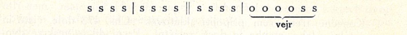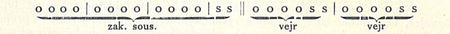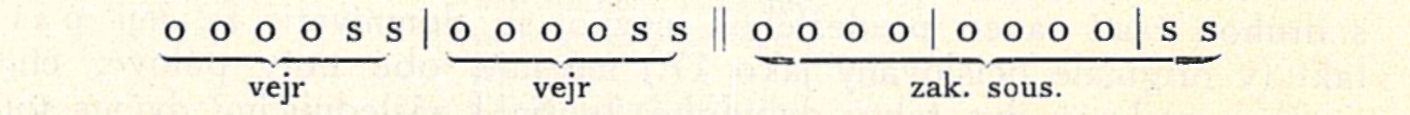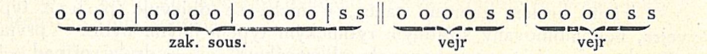 b) Se „zakončením sousedskou" pojí se typ vejra v několika tancích. Především to je „směsek" z C L. 1898, 387. Jest dvojdílný: v prvním dílu obsahuje dva typy vejra, v druhém typ „zakončení sousedskou" (dvěma takty po osmi taktech dvojdobých). Schema jest tedy (tanec třeba opraviti dle prav. I.):