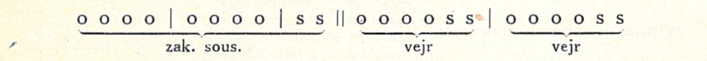 Podobné uspořádání má „směsek" Hol. V. 149. První díl je „zakončení sousedskou", obsahuje však motiv, od předešlého zcela odlišný. Setkáme se s ním opětně v oddílu 10, neboť tvoří taktéž první díl několika tanců (viz příklad L.). Za to druhý díl — dva typy vejra — užívá opětně motivu „karafiát" (př. XXXIII., díl druhý). Rytmické schéma jest (zápis opravíme dle prav. I.):