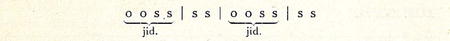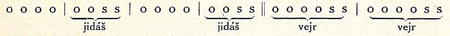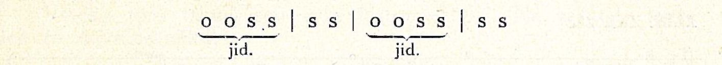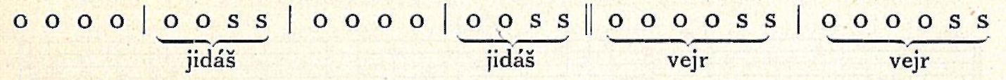 chozím typem Jidáše v nový nějaký typ; také text tance je pomíjí. Rytmické schéma této střední části tedy jest:
