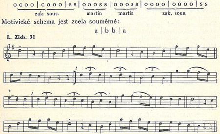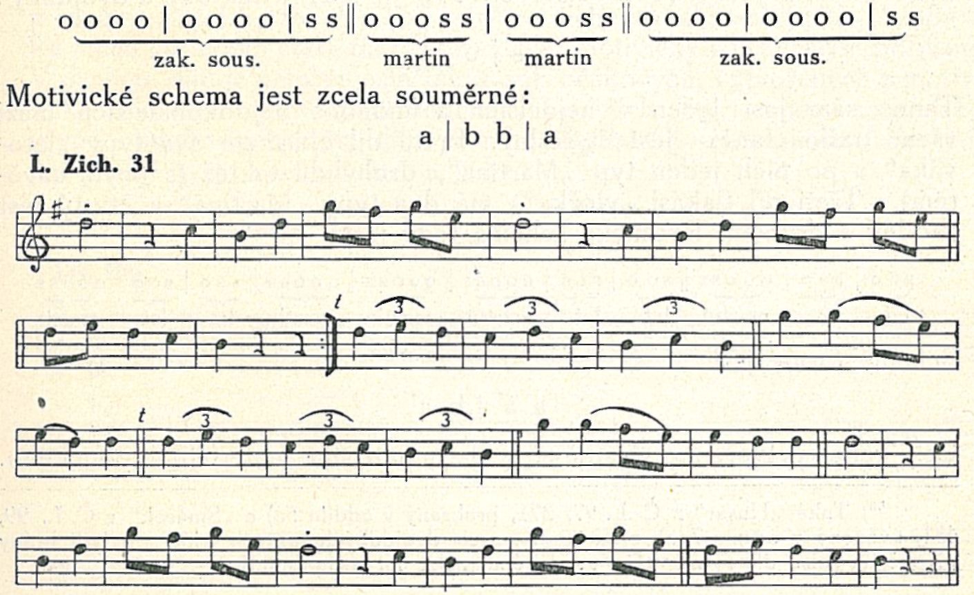 Ve všech třech dvojdobých taktech „Martina" jest takovýchto triolových not tedy děvet — a jest odtud jasno, že zase není možno nahraditi tyto tři dvojdobé takty podle notace furiantské dvěma takty trojdobými. Tentokráte zabráněno bylo tomu čistě hudebně, t. j. triolami, a netřeba pomoci textu, jehož tance s tímto motivem „Martina" vůbec nemají.