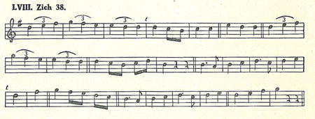 a) První skupina týká se známého tance „O v e s" a jeho variantů.59) „Oves" EN. 592. jest dvojdílný, třídobého tempa volného, po způsobu menuetu. Jeho malý variant jest „Oves" Chr. 485. dole (druhý notový příklad.) Podle Zemánkova popisu tančí se celý valčíkem, což je možno jen tak, že se rozštěpuje každý jeho tříčtvrtní takt na dva (tříosminové) takty valčíku. Je to rozhodně „moderní" způsob tance pro „Oves" a „rytmus celé melodie se tomu vzpírá. Větší variant jest můj zápis z Zehuňska („Oves") tím, že se v posledním taktu druhého dílu vrací к motivu úvodnímu:
