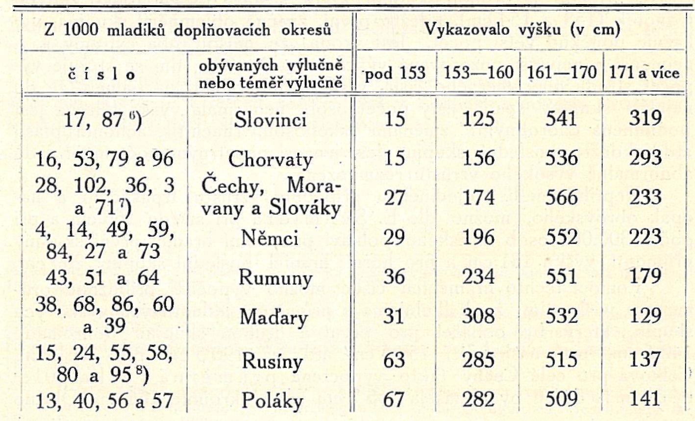 Pokud se národnostních rozdílů týče, podává „Militärstatistisches Jahrbuch" ročně v promilových číslicích přehled o tělesné výšce osob v prvních třech třídách stáří к odvodům se dostavivších pro jistý počet doplňovacích okresů, které možno pokládati za národnostně úplně nebo téměř úplně čisté. Shrnul jsem opět průměr pro šestiletí 1889—1894 do následující tabulky.
