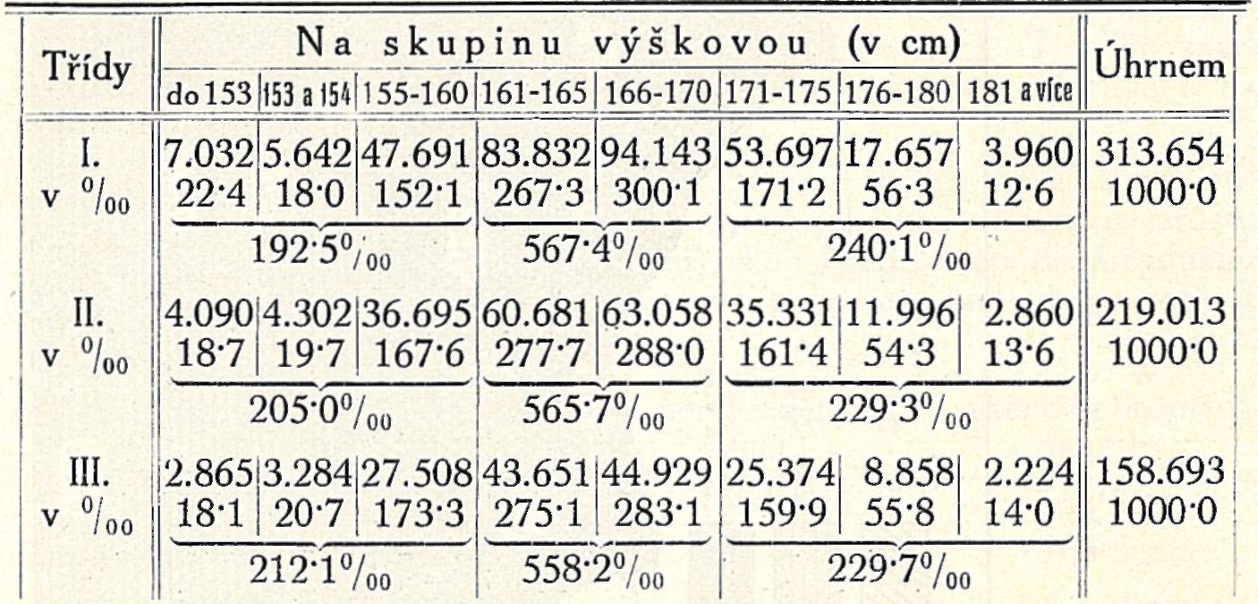 Z přehledu toho jest patrno, že od třídy к třídě mladíků malého vzrůstu poměrně (dle promillové číslice) přibývá a naopak vysokorostlých ubývá. Jen kdybychom měli po ruce měření vojínů po dobu jich služby vojenské, podávala by nám jakýsi obraz vzrůstu mladého muže v těchto letech, ačkoliv by ani tento výsledek neodpovídal celkovému průměru, jelikož by šlo jen o mladíky zdatné, zvláště vybrané.