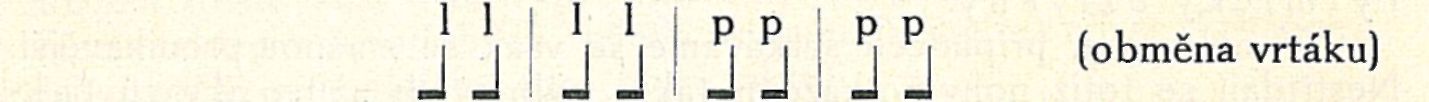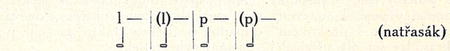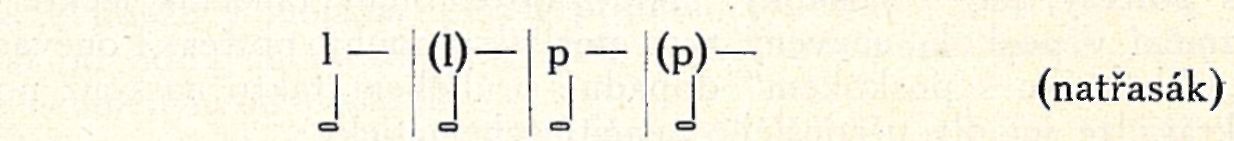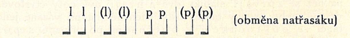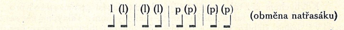 Podle toho, co jsem o poměru poskoku a potřesu pověděl, jest jasno, že v případě právě vylíčeném může skok nahrazen býti pouhým potřesem, ovšem jen tehdy, když se dva takty za sebou tančí na téže noze; při měně nohou se pak jen prostě přešlápne. Tak vzniká variant, který nazvu všeobecně „natřás ák"; schéma jeho jest dle předešlého značení: