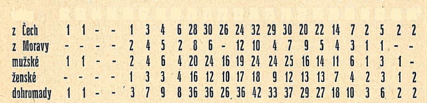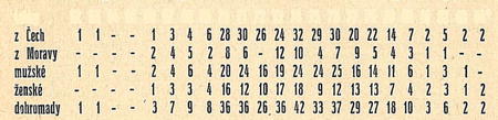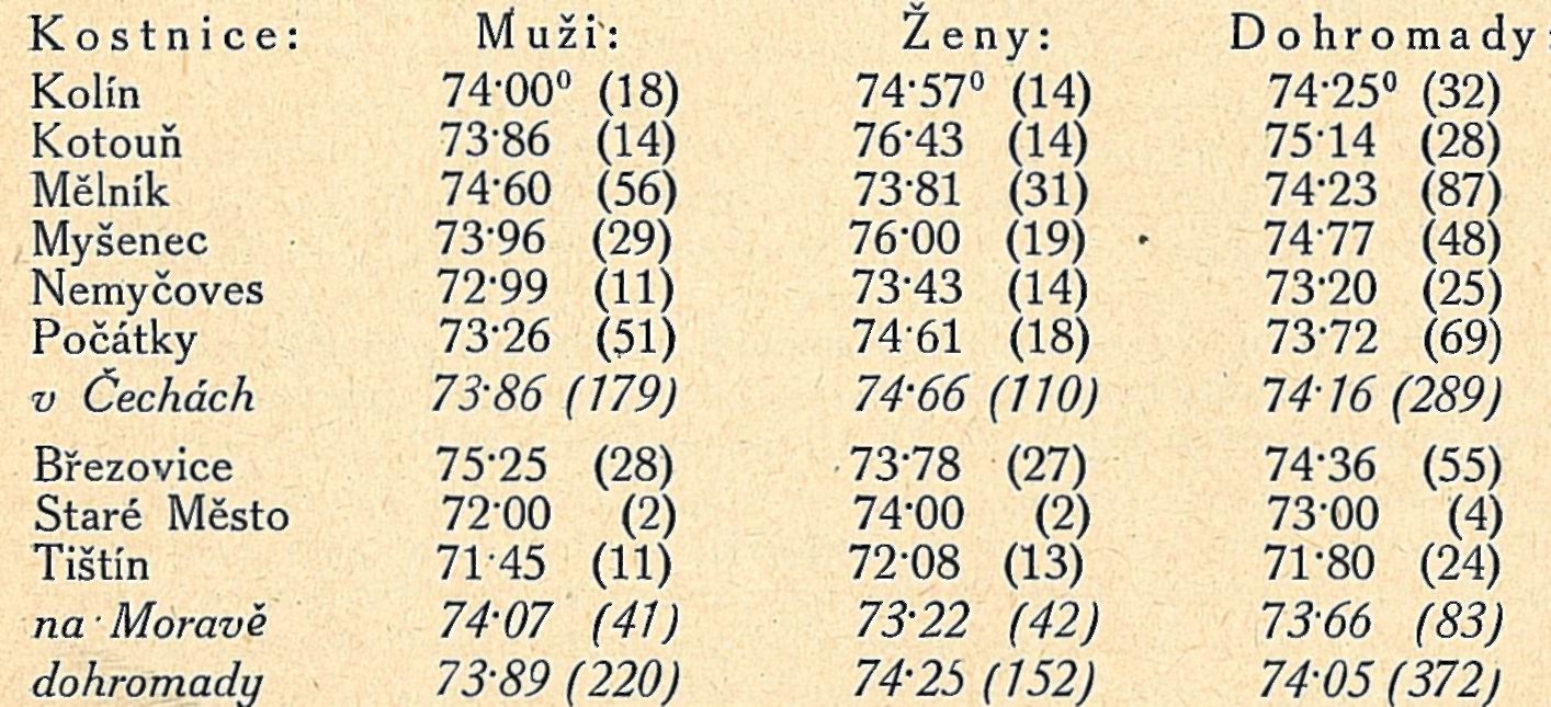Průměrná odchylka při Rivetovu úhlu obnáší pro lebky české 2'86, moravské 3'24, pro všechny dohromady 2'94, odchylka stálá pak pro lebky české 3'640, moravské 4028 a oboje dohromady 3'888; variační kofficient pro všechny dohromady 5'25°/0.