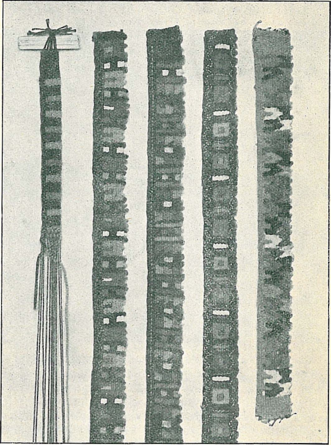 Obr. 3. Tkané čipky z Horní Poruby (a—d) a z Mojtína (e) u Iľavy.