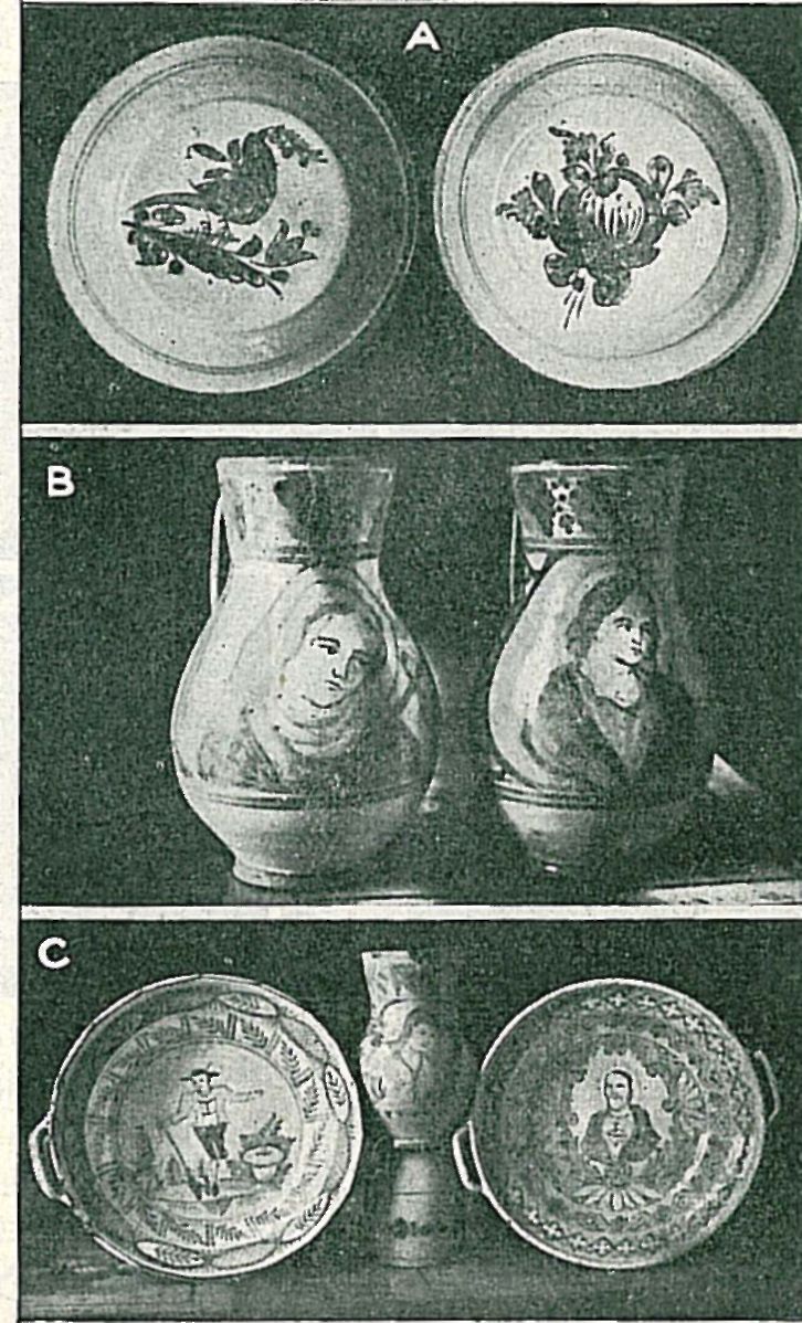 kusy Šindelářovy výroby. Pan farář Va.něk shledal dosud pět kousků, které považuje za místní výrobu. Z nich nejdůležitější je toufarový nástěnný obrázek z roku 1851 (obr. 19A), který visel nade dveřmi v dílně Šindelářově v domě čís. 30 v Pavlících (je tu zachována i hrnčířská pec).