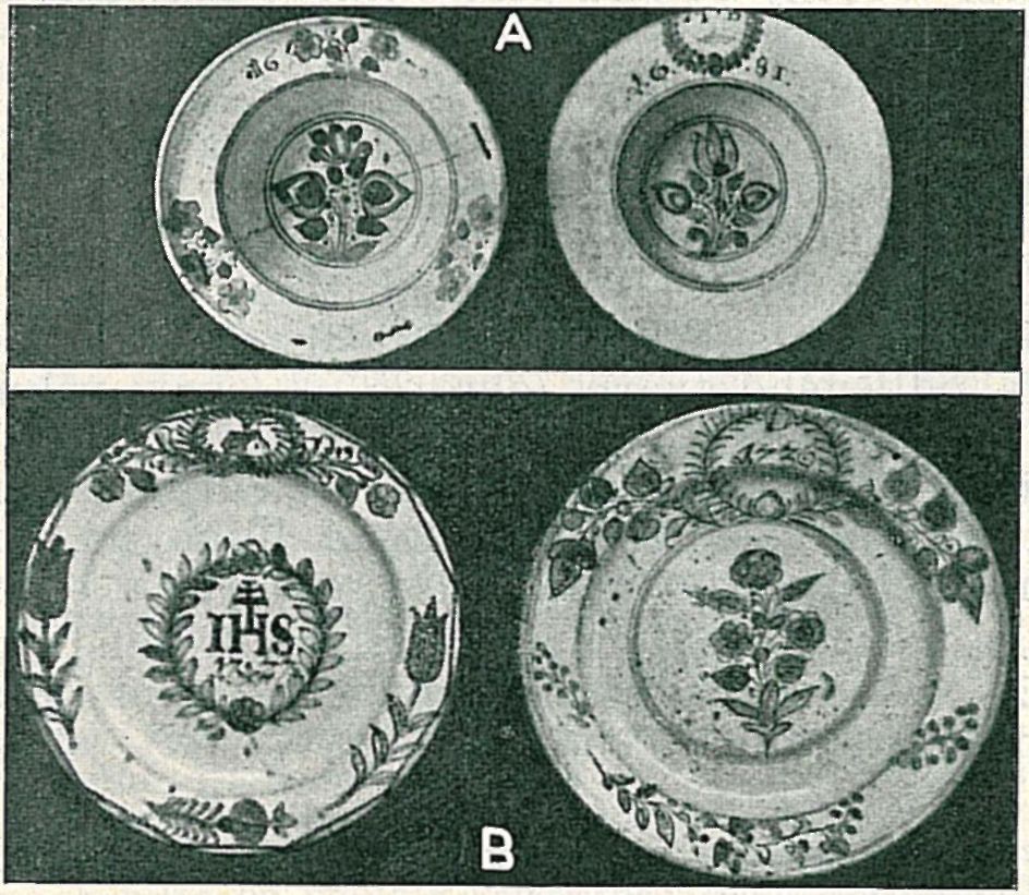obr. 26. 1, 2. Mezi hrnčíři v cechu meziříčském sdruženými museli býti i někteří toufaři. Svědčí o tom jednak v okr. domácí příjmení Toufar, jednak pak četné pestře malované předměty z počátku 18. stol., z nichž ukázkou zobrazujeme dva talíře ze sbírek musea ve Vel. Meziříčí (obr. 27. B). Majitel, starý občan Svoboda z Měřína, tvrdil o nich, že pocházely od místního hrnčíře.11) Mnoho výrobků tohoto typu, datujících se již od konce