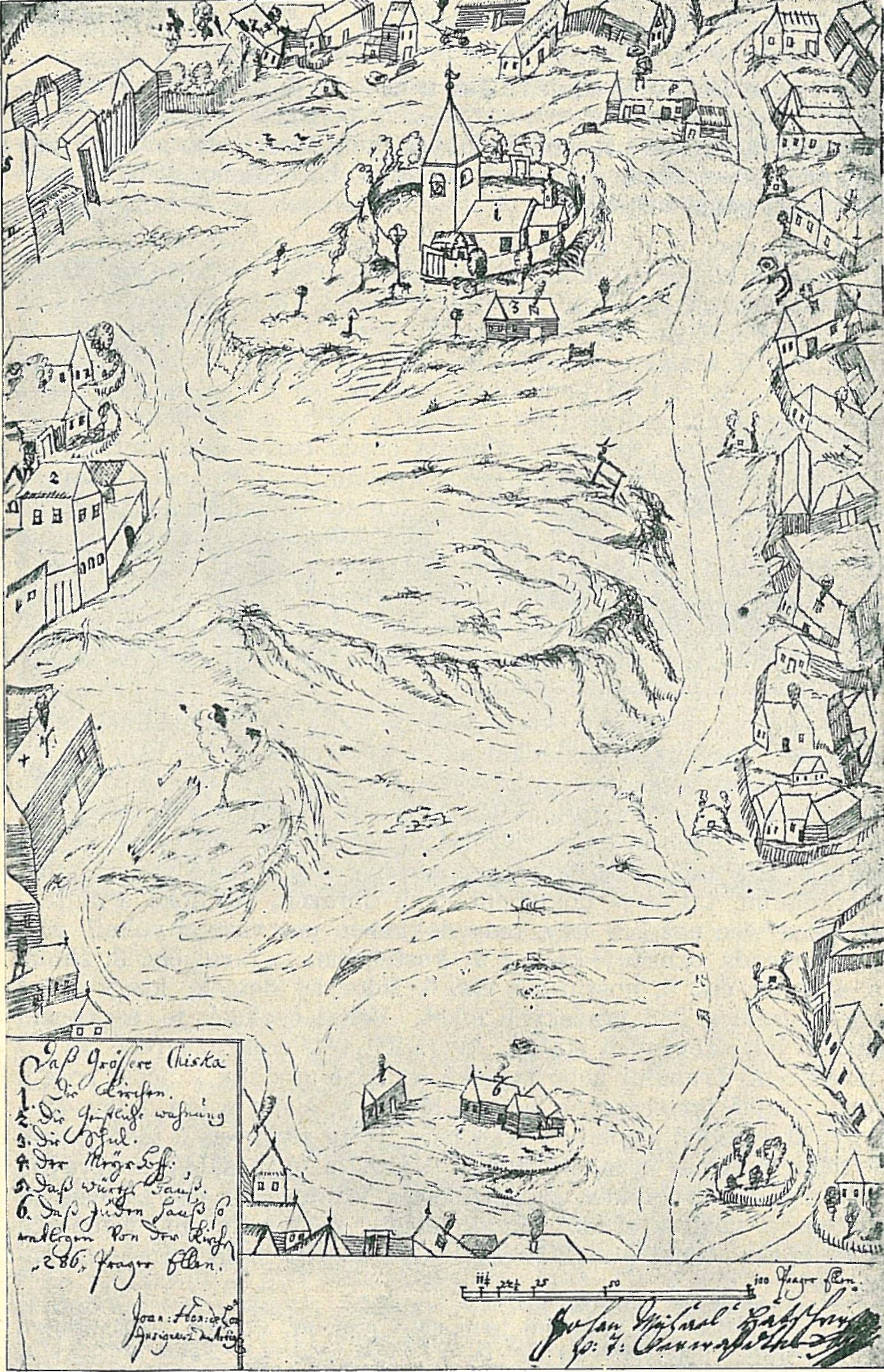 Plastický plánek z r. 1727. Vesnice se připomíná r. 1143.
